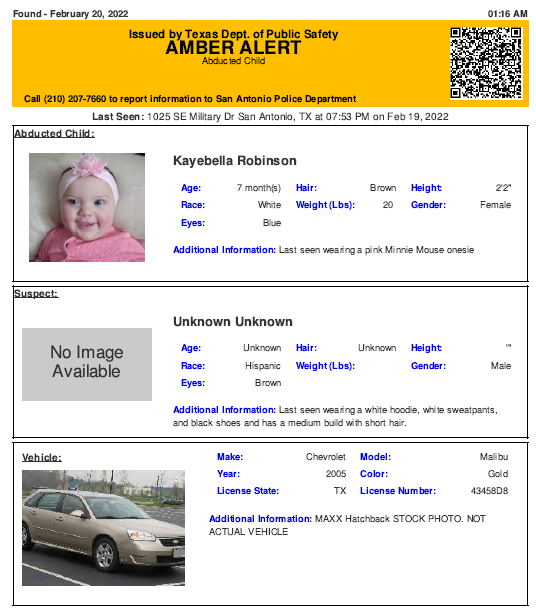 Texas Amber Alert: Kayebella Robinson abducted in San Antonio A Texas Amber Alert has been issued for 7-month-old Kayebella Robinson after the vehicle she was in was stolen in San Antonio, local officials say. The incident happened at 7:53 p.m. on Saturday when a car was stolen outside 1025 SE Military Drive in San Antonio, according to the amber alert.