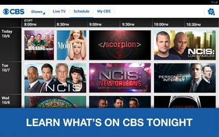 TV Listings and Schedule for CBS Shows See TV Listings and the latest times for all of the primetime CBS Shows lineups. A full schedule of programming for the next few weeks of what will be airing on CBS.