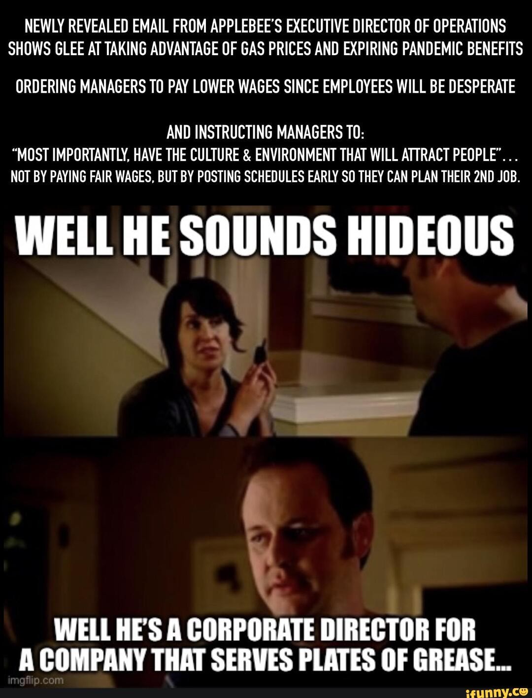 Applebee's Exec Gloats Over High Gas Prices, Hopes They Will Lead... According to leaked emails, Applebee's franchise executive Wayne Pankratz was enthusiastic about skyrocketing gas prices and encouraged his locations to lower their wages.