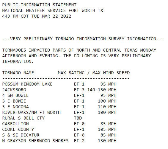Texas tornado outbreak kills at least one | KUT Radio ... The woman lived in the Grayson County community of Sherwood Shores, located about 70 miles north of Dallas. More than a dozen people were injured. The storms in North Texas were part of a powerful system that caused several tornadoes in and around the Austin area as well. Fatality confirmed in Texas tornadoes, victim was age 73 ... As of Tuesday morning, the National Weather Service documented 20 reports of tornadoes (based on the filtered reports), which were not yet confirmed. "One confirmed fatality, female, age 73, a...