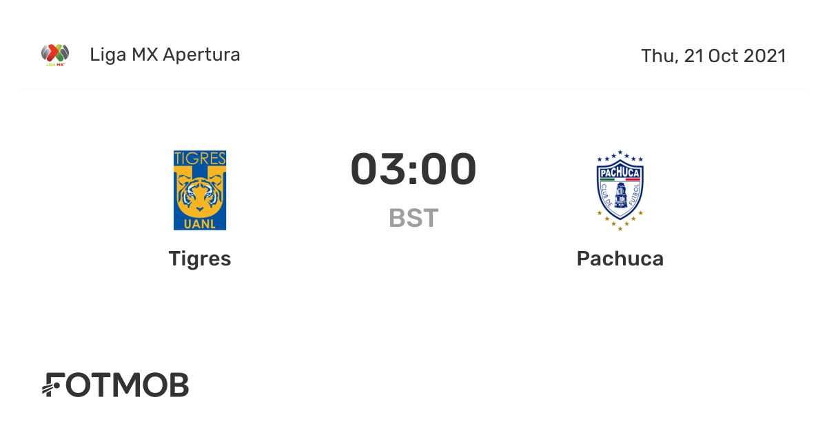 Tigres UANL - Pachuca live score and H2H football match ... Tigres UANL vs Pachuca. Tigres UANL Oct 21, 2021 02:00. 3 - 0 FULL TIME Pachuca Mexico Apertura - Round: 14 Tigres UANL vs Pachuca 21/10/21 Timeline 0' HT 9 ' 12 ' 49 ' FT 3 Goals 0 6 Goal attempts 6 3 Corners 6 0 Penalties 0 5 Fouls 4 2 ...